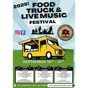 Stone Tree Farm & Cidery will have multiple foods truck and live music throughout the weekend! Join them from 12pm-8pm Friday 9/19 through Sunday 9/21.
